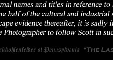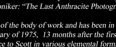 The “HARDCOAL CHRONICLES” is the formal name of the body of work and has been in continuous use, along with ‘Starkkohlenfelder of Pennsylvania’ since January of 1975, 13 months after the first image was made. “The Last Anthracite Photographer” emerged as a reference to Scott in various elemental forms in the late 1970s, but was formalized by Dominic Keating, President of the Anthracite Heritage Museum and Iron Furnaces Associates, and Dan Perry of the Anthracite Museum Complex and Iron Furnaces, in the early 1990s during the lead up to “Through Cultural Eyes” — The Twentieth Anniversary Retrospective of The Hardcoal Chronicles exhibit beginning with initial lecture presentations on November 9, 1995 and later displayed continuously at the Anthracite Heritage Museum’s Hennemuth Gallery, presenting 210 images throughout four specially- constructed rooms, until January 8, 1997 when the Commonwealth insured and stored it for over a decade. During this mid-1990s period, fourteen newspaper articles and numerous websites, some from outside of Pennsylvania, made continual mention of these formal names and titles in reference to Scott’s work. Due to the loss of the Anthracite Railroads (fully one half of the cultural and industrial story), and the rapid disappearance of Hardcoal cultural landscape evidence thereafter, it is sadly impossible since 1976 for there to be another true Anthracite Photographer to follow Scott in succession.